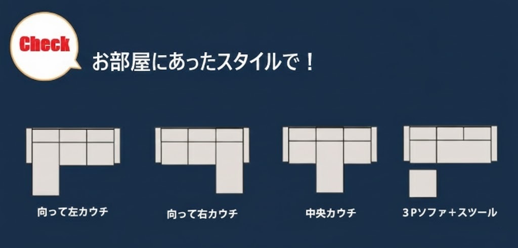 3P+スツールスタイル、左・右カウチスタイル、中央カウチスタイルの4WAYソファ