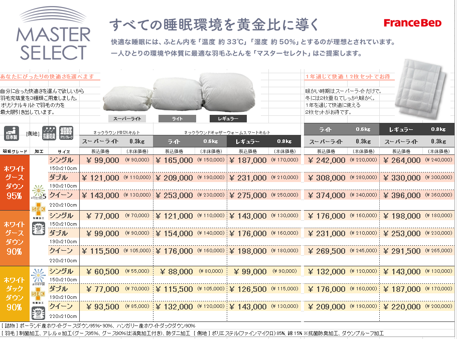 | 羽毛布団 Q MS-D90レギュラー0.8㎏ | – | ¥143,000 | 220x210 | ハンガリー産ホワイトダックダウン90%・フェザー10% |