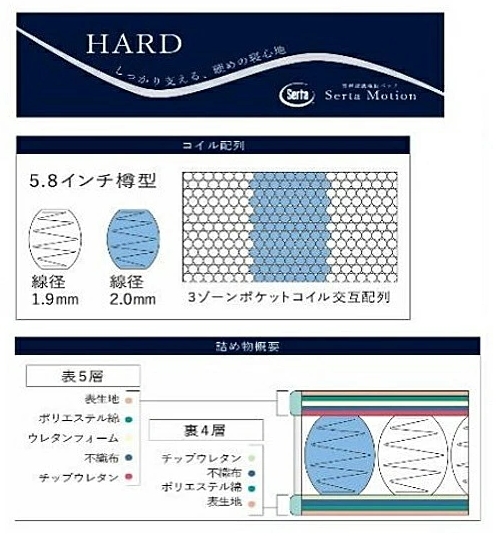 マットレスは、しっかり腰を支える硬めの寝心地 3ゾーンポケットコイル交互配列